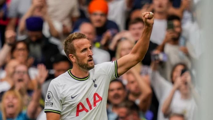 टोटेनहम हॉटस्पर और वॉल्वरहैम्प्टन वांडरर्स के बीच इंग्लिश प्रीमियर लीग मैच के दौरान लंदन के टोटेनहम हॉटस्पर में शनिवार, 20 अगस्त, 2022 को पहला गोल करने के बाद जश्न मनाते हुए टोटेनहम के हैरी केन। (एपी फोटो/फ्रैंक ऑगस्टीन)