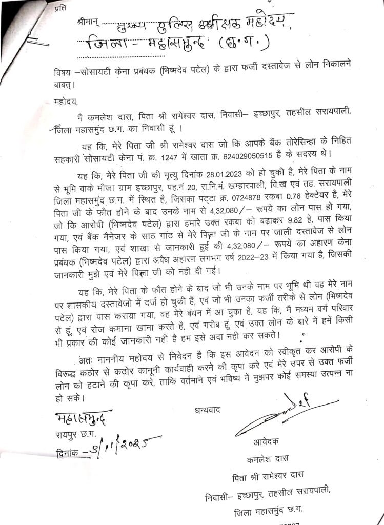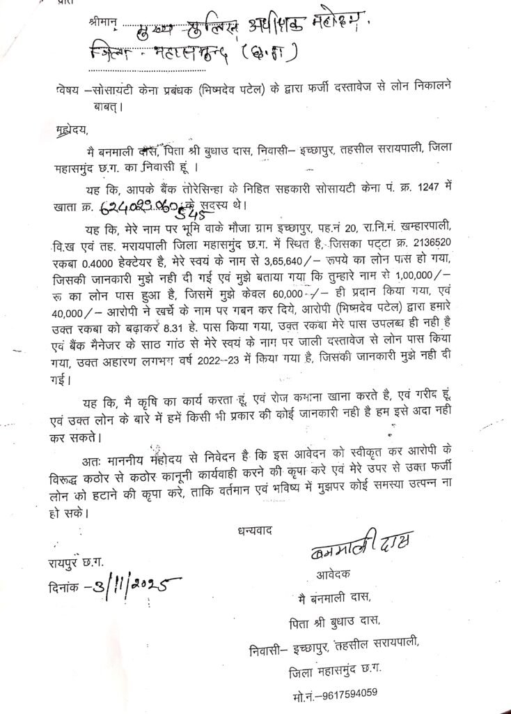 IBN24 Desk : महासमुंद (छत्तीसगढ़) महासमुंद जिला फर्जीवाड़ा का महासमुन्द्र है यहाँ हर रोज नित नए फर्जीवाड़ा उजागर होता है। मामला महासमुंद जिले के सरायपाली ब्लाक के तोरेसिंहा सहकारी बैंक के अंतर्गत आने वाले सेवा सहकारी समिति केना का है जहाँ किसानो के खेती के रकबा में कूट रचना कर उनके रकबा को फर्जी ढंग से बढ़ाया गया वर्ष 2023-24 और करोड़ो रूपये केसीसी लोन निकाला गया था। फर्जीवाड़ा का खुलासा होने के बाद अब नया मामला सामने आ रहा है जिसमे 2022-23 में भी केना सहकारी समिति में इसी प्रकार फर्जीवाड़ा किया गया है, अब पीड़ित किसान इस मामले की शिकायत महासमुंद पुलिस अधीक्षक कार्यालय में किया है और न्याय की गुहार लगा रहे है।