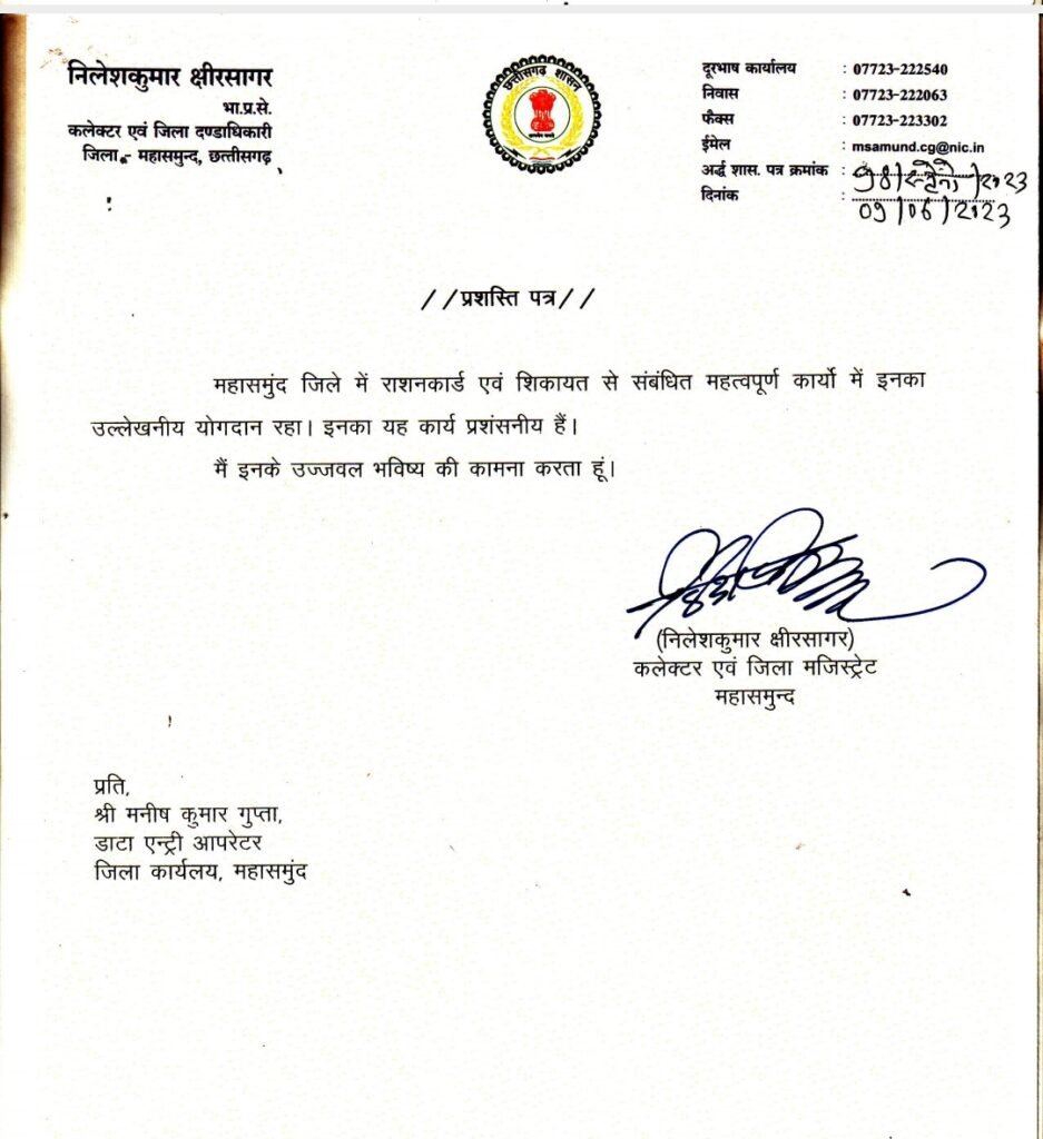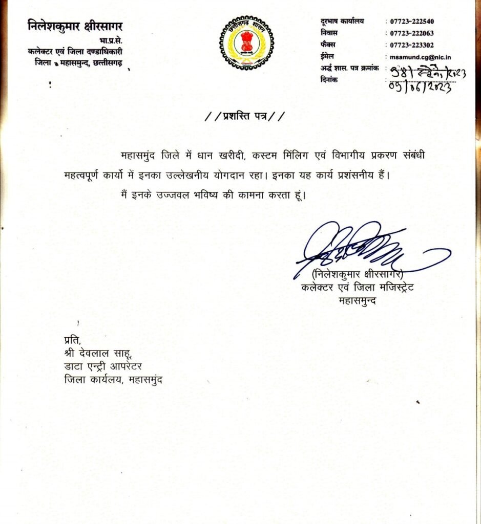 महासमुंद कलेक्टर एवं जिलादण्डाधिकारी निलेश कुमार क्षीरसागर द्वारा खाद्य विभाग महासमुन्द के दो डाटा एंट्री आपरेटर देवलाल साहू को धान खरीदी, कस्टम मिलिंग एवं विभागीय प्रकरण के लिये एवं मनीष कुमार गुप्ता को राशनकार्ड एवं विभागीय शिकायतों के निराकरण करने के लिये प्रशस्ति पत्र प्रदान किया गया। जिसमे कलेक्टर ने उनके उज्जवल भविष्य की कामना किया है।