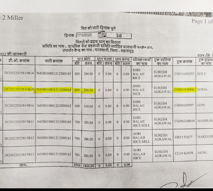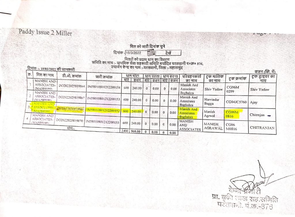 ऐसे ही गाड़ी क्रमांक CG06M0816 जिसका मॉडल न lpt 1109/Hex2, ये 6 चक्का ट्रक है इसमें भी 600 बोरी यानी 24 टन धान का परिवहन मनिष एसोसिएट राईस मील के लिए हुआ जबकि ये 6 चक्का ट्रक है जिसमें 18 टन से ज्यादा वजन लोड ही नही किया जा सकता। लेकिन 24 टन धान का परिवहन होना बताया गया।