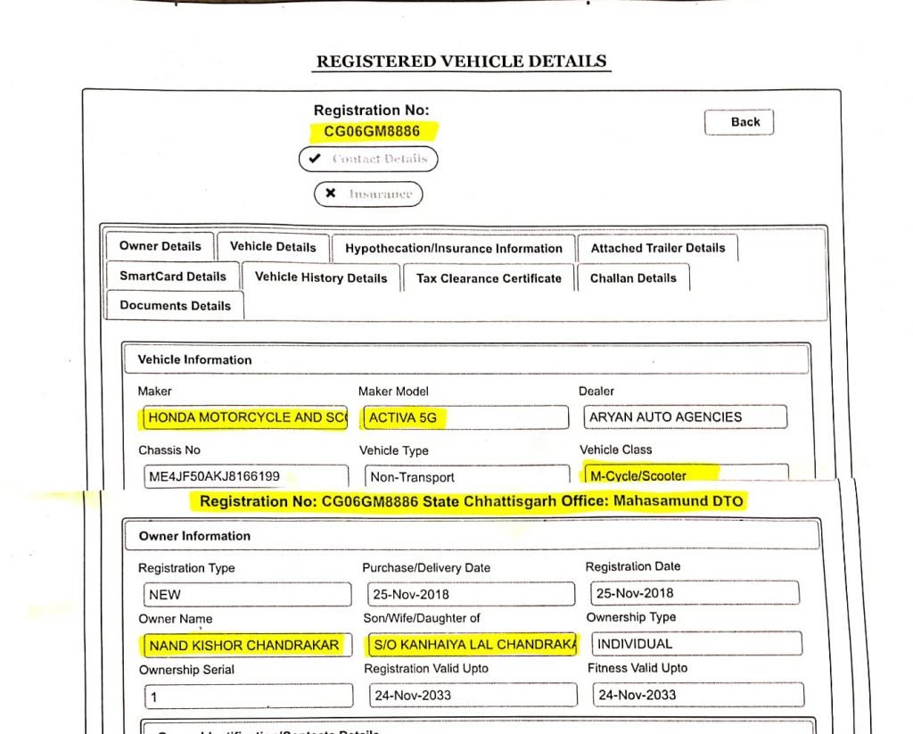 17 मार्च को गाड़ी क्रमांक CG06GM8886 से परसवानी धान खरीदी केंद्र से श्री बालाजी राईस मील में 600 बोरी यानी 24 टन धान का परिवहन होना बताया गया। इस गाड़ी को ट्रक बताया गया जबकि CG06GM8886 होंडा कंपनी की एक्टिवा मोटर सायकल है।