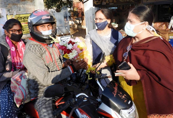 MAHASAMUND [CHHATTISGARH ] महासमुन्द-यातायात नियमों के प्रति जनजागरूकता के लिए डिप्टीकलेक्टर ऋतु हेमनानी और सीमा ठाकुर द्वारा गुरुवार मकर संक्रांति के दिन शहर की मुख्य सड़क पर गांधीगीरी की गयी। यातायात नियमों का पालन करने और हेलमेट लगाए वाहन चालकों को पुष्पगुच्छ देकर स्वागत किया गया। हेलमेट पहनकर दुपहिया वाहन चलाने वाले हरेंद्र कुमार, दीपक, लक्ष्मी दत्त, पवन आदि थे जिनको पुष्पगुच्छ देकर स्वागत किया गया ,वही हेलमेट न पहनने और यातायात नियमों का उल्लंघन करने वाले वाहन चालकों को हेलमेट पहने आदत में सुधार की नसीहत दी। बिना हेलमेट के दुपहिया वाहन चालकों ने अपनी गलती मानी और भविष्य में हेलमेट पहन कर ही वाहन चलाने का वादा किया। दोनों डिप्टी कलेक्टर ने कहा कि जान है तो जहान है। उन्होंने अपने और अपने परिवार की खुशी के लिए हेलमेट पहनने का संदेश दिया। मालूम हो कि नए कलेक्टर डोमन सिंह ने पदभार सम्भालने के बाद अपनी पहली बैठक में महासमुंद जिले में हो रही सड़क दुर्घटनाओं में सबसे बड़ी वजह बाईक चालकों का हेलमेट नहीं पहनना रहा है। उन्होंने इसके लिए लोगों को जागरुक करने के लिए अधिकारियों को निर्देशित किया और कहा कि हेलमेट पहनने वालों को फूल देकर उनका स्वागत किया जाए। हेलमेट नहीं लगाने वालें चालकों को हेलमेट पहनने के लिए जागरुक करें। इससे यातायात पुलिस की भी मदद होगी।