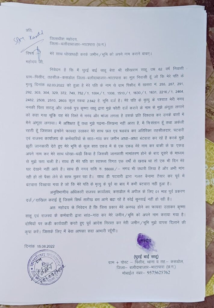 पीड़िता ने कलेक्टर को सौंपे ज्ञापन में कहा कि मेरे पति के मृत्यु बीते 2 मार्च को हुआ था मेरे पति के नाम से ग्राम पिसीद में खसरा नं. 255, 287, 291, 292, 303, 304, 329, 372, 749, 752/1, 1004/1, 1008, 1510/1, 1630/1, 1631, 2216/1, 2464, 2482, 2508, 2510, 2603 कुल रकबा 2.842 हे. भूमि दर्ज है। मेरे पति के मृत्यु के पश्चात मेरी ननद ननकी पिता सरजू और उनके पुत्र कृष्णा साहू द्वारा मुझे फौती दर्ज कराने के नाम से मुझे अंगूठा लगाने को कहा गया चूंकि यह मेरे रिश्ते में ननंद और भांजा लगता है उसके प्रति विश्वास कर उनके बातों में मैने अंगूठा लगाया। मै अशिक्षत हूॅ तथा मुझे पढ़ना-लिखना नहीं आता है, मै निःसंतान हूूॅ तथा अकेली रहती हूॅ जिसका इन्होंने फायदा उठाकर मेरे साथ छल एवं षडयंत्र कर अतिरिक्त तहसीलदार, पटवारी एवं राजस्व कार्यालय के कर्मचारियों सेे साठ-गांठ कर जमीन आधा-आधा बंटवारा कर रहें है करके मुझे झूठी जानकारी देते हुए मेरे भूमि के कुल सात एकड़ में से एक एकड़ मेरे नाम कर बाकी के छः एकड़ अपने नाम कर मेरे साथ धोखा-धड़ी किया है जिसकी जानकारी नामांतरण होने के बाद दूसरे के माध्यम से मुझे पता चली है। साथ ही मेरे पति का स्वास्थ्य विगत एक वर्षों से खराब था तो एक भी दिन मेरे घर देखने नहीं आये है। साथ ही नगद राशि रु. 55000/- नगद भी उधारी लिया है और अभी मांग रही हो तो पैसा लेने से साफ मुकर रहा है। साथ ही पटवारी द्वारा गलत बैनामा तैयार कर पूर्व में बंटवारा दिखाया गया है जो कि मेरे पति के मृत्यु के पूर्व या बाद में कभी बंटवारा नहीं हुआ है। लेकिन शिकायत के बावजूद अभी तक कोई कार्रवाई नही होने से पीड़िता ने जिले के संवेदनशील कलेक्टर रजत बंसल से उचित जांच करवाकर कार्रवाई की मांग की है।