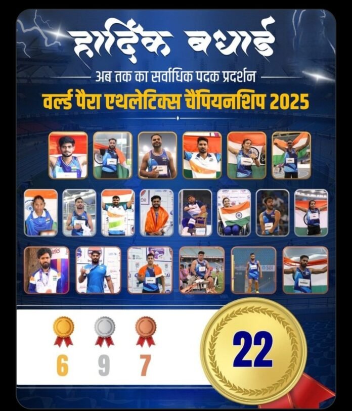 IBN24 Desk : रायपुर (छत्तीसगढ़)नई दिल्ली में आयोजित वर्ल्ड पैरा एथलेटिक्स चैंपियनशिप 2025 में भारत के पैरा-एथलीट्स ने अदम्य जज़्बे और अथक परिश्रम के बल पर विश्व पटल पर नया इतिहास रच दिया है। इस प्रतिष्ठित प्रतियोगिता में भारतीय दल ने अब तक का सर्वश्रेष्ठ प्रदर्शन करते हुए 6 स्वर्ण, 9 रजत और 7 कांस्य सहित कुल 22 पदक जीतकर देश का नाम रोशन किया है।