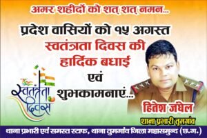IBN24 Desk : महासमुंद [ छत्तीसगढ़ ] महासमुंद कलेक्टर विनय कुमार लंगेह ने आज 79 वें स्वतंत्रता दिवस पर जिला कार्यालय कलेक्ट्रेट परिसर में ध्वजारोहण किया। कलेक्टर ने उपस्थित अधिकारी-कर्मचारियों को 79 वें स्वतंत्रता दिवस की बधाई एवं शुभकामनाएं दी। इस अवसर पर कलेक्टर श्री लंगेह ने कहा कि स्वतंत्रता दिवस हमारे राष्ट्रीय कर्तव्यों की याद दिलाने का दिन है। आज़ादी हमें अनेक बलिदानों और संघर्षों के बाद मिली है, और इसे बनाए रखना तथा देश को आगे बढ़ाना हम सबकी जिम्मेदारी है। उन्होंने कहा कि राष्ट्र की प्रगति तभी संभव है जब हम ईमानदारी, निष्ठा और एकजुटता के साथ कार्य करें।