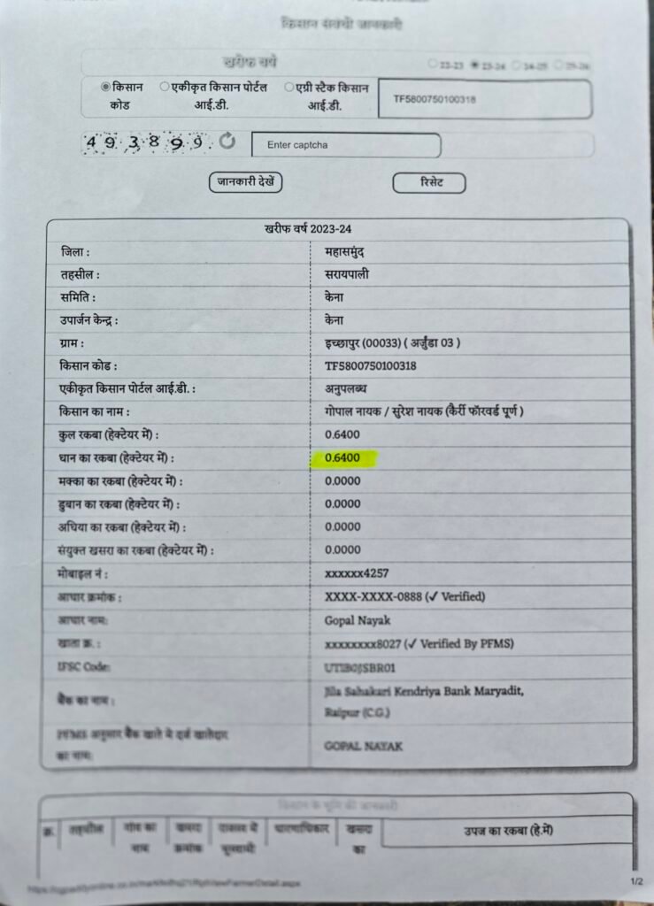 प्रकरण क्रमांक 03 – गोपाल नायक पिता सुरेश नायक इनके पास कुल खेती की ज़मींन 0.6400 हेक्टेयर है यानी 1 एकड़ 6 डिसमिल इनके नाम पर 385599 रुपये केसीसी लोन निकाल लिया गया।