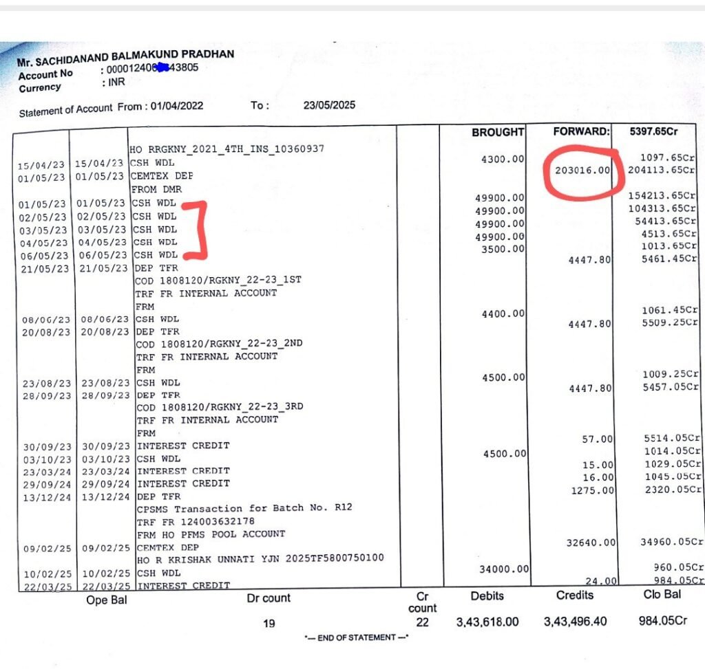 प्रकरण क्रमांक 01 – सचिदानंद पिता बालमकुन्द प्रधान नानकपाली इनके पास कुल खेती की ज़मींन 0. 8000 हेक्टेयर यानी 02 एकड़ है जिसे बढ़ाकर 7.69 हेक्टेयर यानी 19 एकड़ किया गया और 203016 रुपये नगद लोन निकाल लिया गया। जबकि किसान को लोन सम्बन्धी कोई जानकारी ही नहीं , न ही किसान लोन के लिए आवेदन दिया था, न ही उसने विड्रॉल भरा है, न ही वह बैंक गया है उसके बाद भी उसके नाम से लोन निकाल लिया गया !