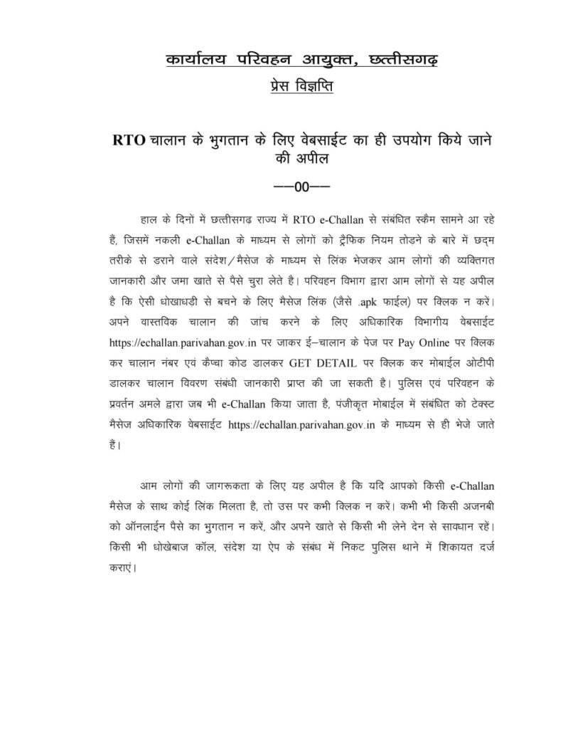 परिवहन विभाग द्वारा आम लोगों से यह अपील है कि ऐसी धोखाधड़ी से बचने के लिए मैसेज लिंक जैसे
