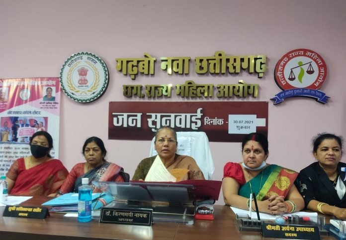 रायपुर। छत्तीसगढ़ राज्य महिला आयोग ने शास्त्री चौक, रायपुर स्थित आयोग कार्यालय में महिलाओं से सम्बंधित प्रकरणों पर आज जनसुनवाई आयोग की अध्यक्ष डॉ किरणमयी नायक ने नवनियुक्त सदस्यगण सुश्री शशिकांता राठौर, श्रीमती नीता विश्वकर्मा, श्रीमती अर्चना उपाध्याय के साथ की।