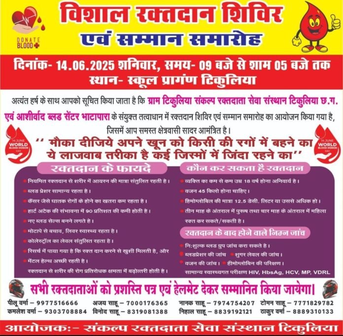 विश्व रक्तदाता दिवस के अवसर में संकल्प रक्तदाता सेवा संस्थान टिकुलिया छत्तीसगढ़ के द्वारा लगातार पांचवा वर्ष 14 जून को गांव के स्कूल परिसर में रक्तदान शिविर का आयोजन किया जा रहा है, ग्राम टिकुलिया को खून के खदान नाम से भी जाना जाता है क्योंकि यहां लगभग 200 रक्तदाता भाई – बहन है जो समय समय पर नियमित रक्तदान करते है छत्तीसगढ़ के किसी भी कोने से किसी को रक्त की जरूरत पड़े और संकल्प रक्तदाता सेवा संस्थान को याद किया जाए तो त्वरित रक्त की उपलब्धता कराई जाती है, संकल्प सेवा संस्थान के माध्यम से संस्था से जुड़े लोगों के द्वारा अब तक लगभग 5000 (पांच हजार) यूनिट रक्त का दान किया जा चुका है, संस्था के संचालक पीलू वर्मा जी स्वयं 49 बार रक्तदान कर चुके है। इस बार का शिविर बहुत खास होने वाला है क्योंकि इस बार 300 यूनिट रक्तदान का संकल्प है, रक्तदाता भाई – बहन का सम्मान हेलमेट एवम प्रशस्ति पत्र देकर किया जाएगा इसके तैयारी जोरों शोरों से चल रही है।