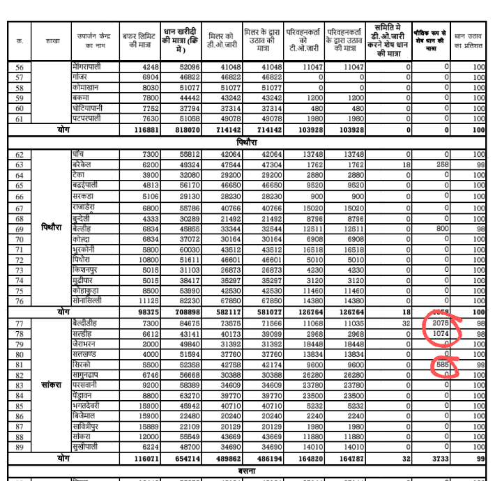 इसी तरह सांकरा ब्रांच के ही धान खरीदी केंद्र सिरको में धान खरीदी वर्ष 2021-22 में 13 करोड़ 8 लाख 95 हजार का, 52358 क्विंटल धान खरीदी करना बताया गया है 26 मई तक ऑनलाइन देखने पर 14 लाख 62 हजार 500 रुपये का 585 क्विंटल धान शेष दिखा रहा है जबकि मौके पर धान नहीं है !
