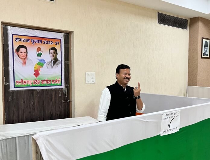 संसदीय सचिव व विधायक श्री चंद्राकर आज सोमवार की सुबह पार्टी के प्रदेश मुख्यालय राजीव भवन पहुंचकर मतदान किया।