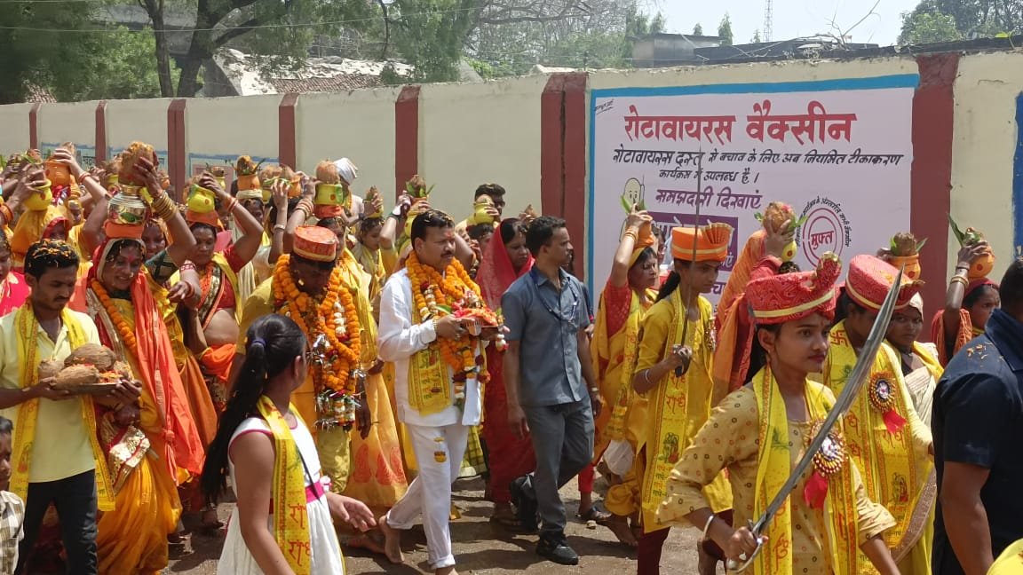 भागवत कथा से पहले नगर में निकाली गई भव्य कलश यात्रा में शामिल हुए संसदीय सचिव।