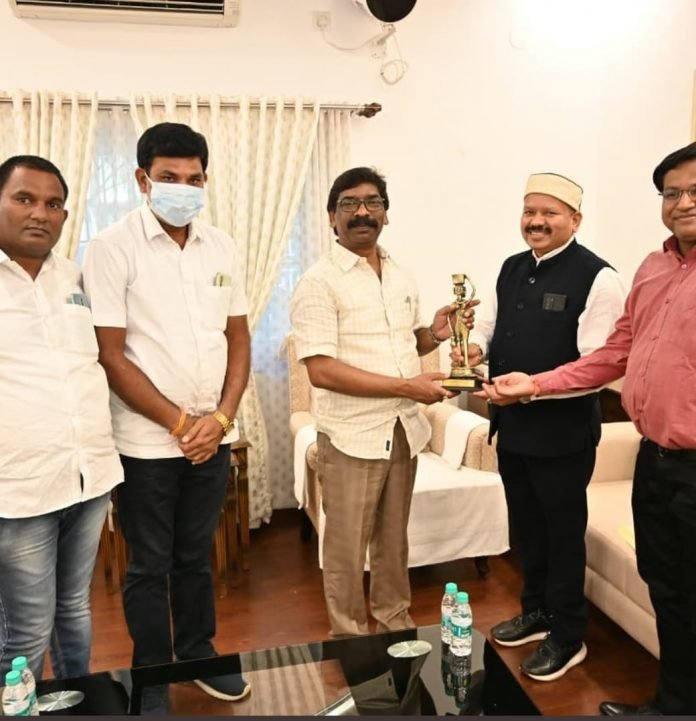 महासमुन्द (छत्तीसगढ़) रांची स्थित मुख्यमंत्री आवासीय कार्यालय में आज बुधवार को मुख्यमंत्री हेमन्त सोरेन से विधायक एवं संसदीय सचिव विनोद चंद्राकर ने मुलाकात की तथा आगामी 28 अक्टूबर से 1 नवंबर 2021 तक छत्तीसगढ़ सरकार द्वारा आयोजित “राष्ट्रीय आदिवासी नृत्य महोत्सव में सम्मिलित होने हेतु आमंत्रित किया। विधायक एवं संसदीय सचिव विनोद सेवनलाल चंद्राकर ने मुख्यमंत्री श्री सोरेन को बताया कि छत्तीसगढ़ में देश और विश्व की सबसे प्राचीन आदिम सभ्यताएं आज भी जीवित हैं। इन सभ्यताओं के संरक्षण तथा उनके मूल स्वरूप को अक्षुण्ण बनाए रखने की दिशा में छत्तीसगढ़ सरकार द्वारा कार्य किए जा रहे हैं। आदिवासी संस्कृति, लोक नृत्य, और लोक संगीत तथा लोक कलाओं को भी बढ़ावा दिया जा रहा है। इसी तारतम्य में आगामी 28 अक्टूबर से 1 नवंबर 2021 तक छत्तीसगढ़ सरकार द्वारा “राष्ट्रीय आदिवासी नृत्य महोत्सव 2021” का आयोजन किया जा रहा है। इस महोत्सव में झारखंड सहित देश के विभिन्न राज्यों से पहुंचे आदिवासी लोक गीत-संगीत तथा नृत्य क्षेत्र के कलाकारों द्वारा सांस्कृतिक कार्यक्रमों की प्रस्तुति दी जाएगी। विधायक श्री चंद्राकर ने मुख्यमंत्री से कहा कि आपके गरिमामयी आगमन से छत्तीसगढ़ की धरा में आयोजित इस महोत्सव की शोभा बढ़ेगी। इस अवसर पर संसदीय सचिव छत्तीसगढ़ शासन विनोद चंद्राकर ने मुख्यमंत्री हेमन्त सोरेन को छत्तीसगढ़ के प्रसिद्ध आदिवासी लोक शिल्प बस्तर आर्ट से बनी स्मृति चिन्ह भेंट की। मुख्यमंत्री हेमन्त सोरेन ने श्री विनोद चंद्राकर को धन्यवाद देते हुए उक्त महोत्सव के सफल आयोजन हेतु छत्तीसगढ़ सरकार को अग्रिम शुभकामनाएं भी दीं। इस मौके पर मुख्यमंत्री के प्रधान सचिव राजीव अरुण एक्का, राज्य प्रशासनिक सेवा छत्तीसगढ़ के अधिकारी राकेश कुमार गोलछा सहित महासमुन्द ब्लॉक कांग्रेस कमेटी अध्यक्ष खिलावन साहू, दिलीप चंद्राकर मौजूद थे।