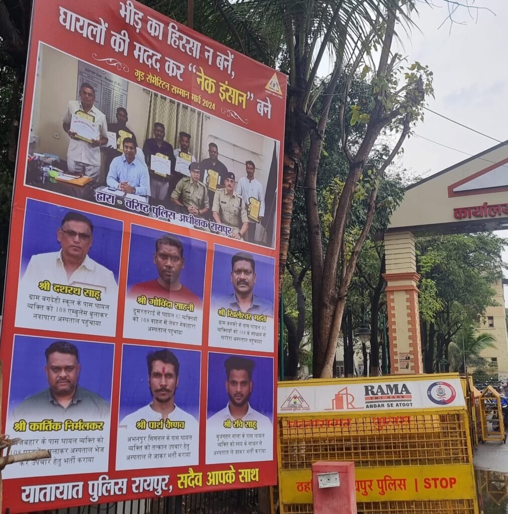 बता दें कि भारत देश में प्रति वर्ष सड़क दुर्घटना में लगभग डेढ़ लाख लोगो की मृत्यु होती है, जिसका प्रमुख कारण घायलों को त्वरित चिकित्सा व्यवस्था उपलब्ध नही होने के कारण होता है। सड़क दुर्घटना के दौरान प्रथम तीस मिनट का समय गोल्डन आवर कहलाता है। इस दौरान यदि घायल व्यक्ति को किसी भी प्रकार से हास्पिटल तक पहुंचा दिया जाता है या फिर चिकित्सा व्यवस्था उपलब्ध करा दिया जाता है तो घायल की जान बचाई जा सकती है। किन्तु अधिकांश सड़क दुर्घटनों में लोगों द्वारा मोबाइल से विडियों फोटो बना लिया जाता है किन्तु घायल की जान बचाने हेतु कोई उपाय नही किया जाता। साथ ही बार बार पेशी जाना पड़ेगा व परेशानी होगी सोचकर मदद नहीं की जाती, जिससे घायल व्यक्ति त्वरित उपचार के अभाव में तड़प-तड़प कर दम तोड़ देता है। जिसे दृष्टिगत रखते हुए वरिष्ठ पुलिस अधीक्षक द्वारा सभी थाना प्रभारियों को निर्देशित किया है कि थाना क्षेत्र में घटित सड़क दुर्घटना में घायल को त्वरित सहायता पहुंचाने हेतु गुड सेमेरिटंस का अधिक से अधिक प्रचार-प्रसार करने एवं घायल को त्वरित सहायता पहुंचाकर जान बचाने वाले गुड सेमेरिटंस को प्रोत्साहित व पुरस्कृत करने हेतु उपस्थित कराने निर्देशित किया गया है। इसी क्रम में रायपुर जिले में घटित विभिन्न सड़क दुर्घटनाओं में घायलों की मदद करने वाले गुड सेमेरिटंस को वरिष्ठ पुलिस अधीक्षक द्वारा मोंमेंटो व प्रशस्ति पत्र देकर सम्मानित किया गया था। साथ ही इनका फोटो बड़े-बड़े होर्डिंग शहर में कई प्रमुख जगहों पर लगाया गया हैं, ताकि दूसरे भी प्रेरित हो सके। सड़क दुर्घटना में घायलों की मदद करने वाले गुड सेमेरिटंस निम्नानुसार है:-