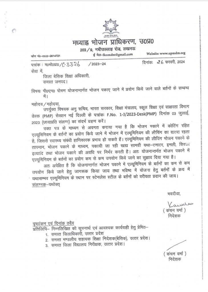 एल्युमिनियम के बर्तनों के हानिकारक प्रभाव को देखते हुए भारत सरकार, शिक्षा मंत्रालय, स्कूल शिक्षा और साक्षरता डेस्क [PMP ] सेक्शन नई दिल्ली के पत्रांक F.No.1-3/2023- Desk [PMP] दिनांक 03 जुलाई 2023 के माध्यम से भी निर्देशित किया गया है जिस पर भोजन पकाने हेतु एल्युमिनियम के बर्तन से होने वाले हानिकारक प्रभाव के कारण फूड ग्रेड स्टेनलेस स्टील के बर्तनों के उपयोग हेतु सुझाव दिया गया है।