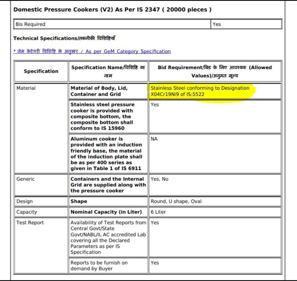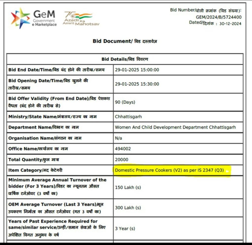 एल्युमिनियम के बर्तनों में बने खाना खाने पर शरीर में प्रतिकूल प्रभाव को देखते हुए महिला एवं बाल विकास विभाग, छत्तीसगढ़ शासन के द्वारा वर्ष 2024 -25 में उक्त पोषण एवं स्वास्थ्यगत सिद्धान्तों को पालन करते हुए आंगनबाड़ी में उपयोग करने हेतु स्टेनलेस स्टील से बने प्रेशर कुकर का क्रय GEM पोर्टल के माध्यम से किया गया है।