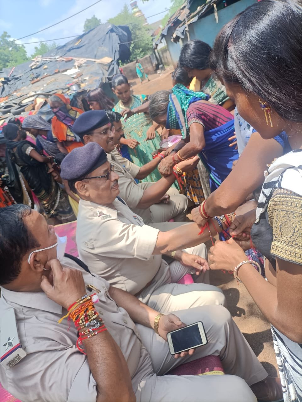 महासमुन्द (छत्तीसगढ़) पूरे देश मे भाई बहनों का पर्व रक्षाबंधन पूरे धूमधाम से मनाया गया। बहनों ने भाइयों की कलाइयों पर राखी से बांधकर अपनी रक्षा का वचन भी लिया। इस रक्षा बंधन पर महासमुन्द पुलिस अलग ही रंग दिखा आज महासमुन्द पुलिस के अधिकारी और जवान इस पर्व पर शहर के वार्ड 04 ईदगाह भाठा के निचली बस्ती देवार मोहल्ला में महिलाओं एवं बच्चियों के साथ रक्षाबंधन का त्योहार मनाया एवं मिठाई एवं स्वलपाहार का भी वितरण किया । पुलिस को अपने बीच पाकर मोहल्ले वाले काफी खुश दिखे।