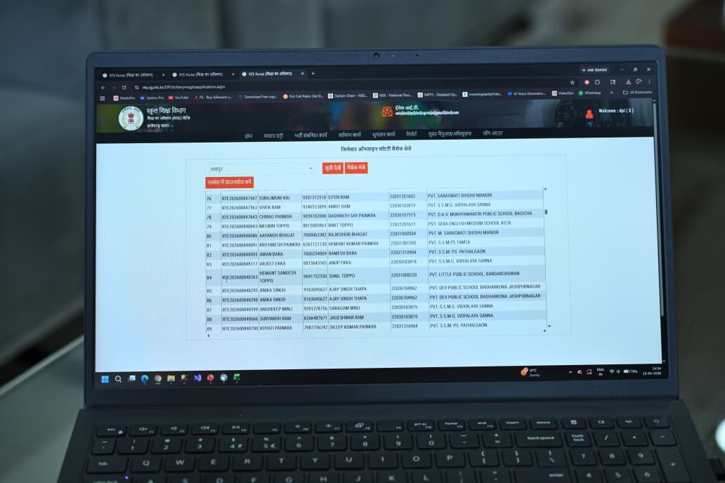 IBN24 Desk: रायपुर (छत्तीसगढ़) छत्तीसगढ़ शासन के स्कूल शिक्षा विभाग द्वारा आज दिनांक 15 अप्रैल 2026 को पूर्व निर्धारित समय-सारणी के अनुसार आर.टी.ई. अंतर्गत निजी विद्यालयों में प्रवेश हेतु प्राप्त आवेदनों की चयन सूची ऑनलाइन लॉटरी के माध्यम से मंत्रालय महानदी भवन के मुख्यमंत्री कक्ष से जारी की गई। यह प्रक्रिया मुख्यमंत्री, छत्तीसगढ़ शासन द्वारा शिक्षा मंत्री की उपस्थिति में सम्पन्न कराई गई। इस अवसर पर तकनीकी शिक्षा मंत्री श्री गुरु खुशवंत साहेब, स्कूल शिक्षा विभाग के सचिव श्री सिद्धार्थ कोमल परदेशी , उपसंचालक लोक शिक्षण श्री अशोक नारायण बंजारा ,आर टी ई प्रभारी श्री महेश नायक सहित अन्य वरिष्ठ अधिकारी उपस्थित रहे।