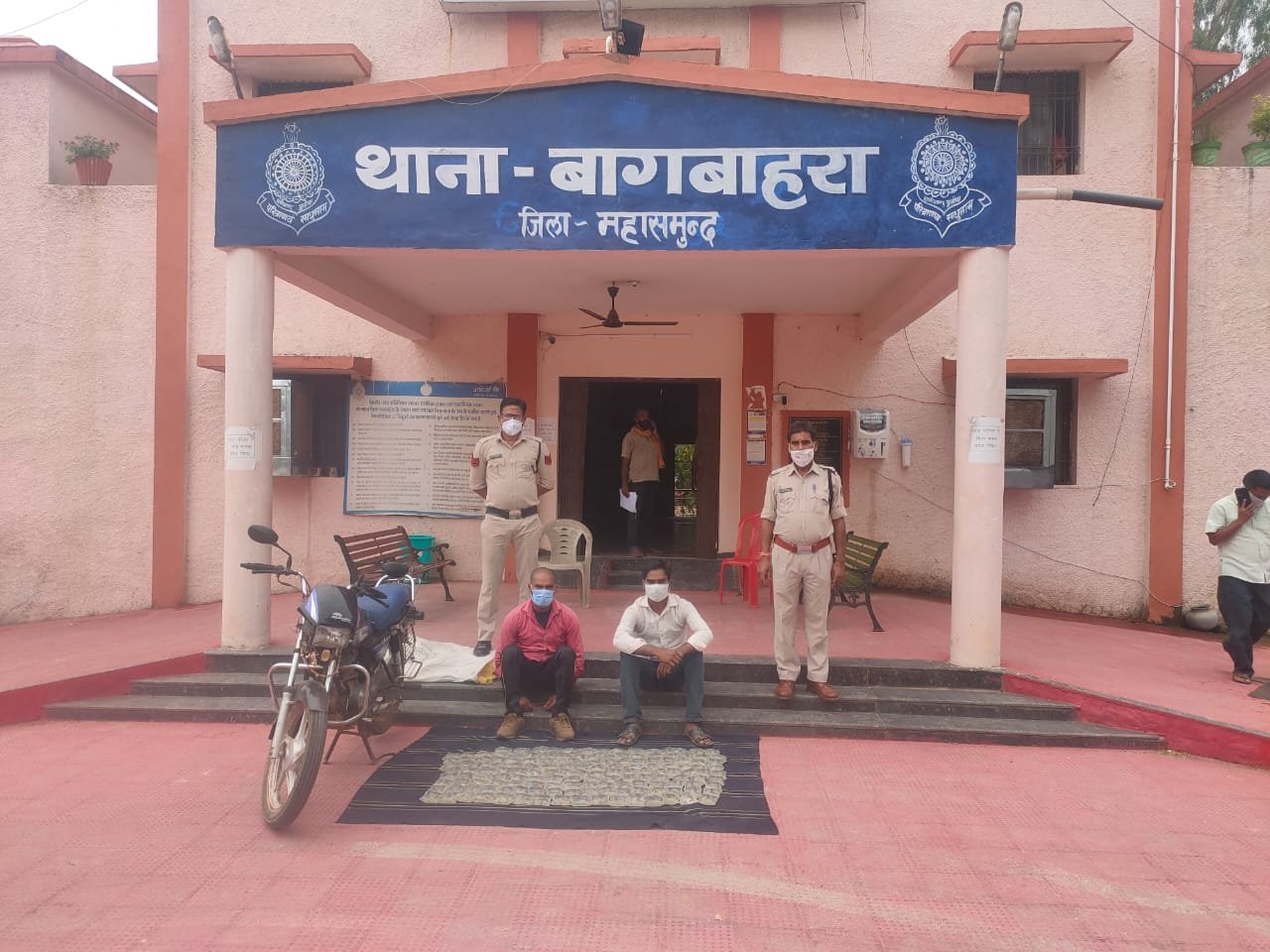 महासमुन्द (छत्तीसगढ़) महासमुन्द जिला उड़ीसा से जुड़ा हुआ है उड़ीसा के सीमावर्ती क्षेत्रों में उड़ीसा से लगातार शराब की तस्करी हो रही है। उड़ीसा से छत्तीसगढ़ के कई जिलों शराब तस्करी।से पूछ रही है छत्तीसगढ़ में लॉक डाउन होने से सराब की दुकान बंद है ऐसे में तस्कर अधिक वैसे कमाने के चक्कर मे उड़ीसा से सराब की तस्करी कर रही है वैसे महासमुन्द पुलिस ने तस्करों के खिलाफ अभियान छेड़ रकह है जहाँ रोज शराब तस्कर पुलिस की पकड़ में आ रहे है ताजा मामला महासमुन्द जिले के बागबाहरा थाना का है जहाँ मुखबिर की सूचना पर NH353 रोड पिथौरा चौक बागबाहरा के आरोपी  01. शत्रुहन कुमार मन्नाडे पिता स्व0 राधेश्याम मन्नाडे उम्र 33 साल साकिन  धो भट्ठी थाना खरोरा जिला रायपुर छ0ग0 हाल रमन टोला महासमुन्‍द जिला महासमुन्‍द, 02. राजेन्द्र प्रसाद मन्नाडे पिता मिट्ठा लाल मन्नाडे उम्र 38 साल  साकिन  धोबभट्ठी थाना खरोरा जिला रायुपर छ0ग0  के सयुक्त कब्जे से 01. एक काले रंग का हीरो स्प्लेण्डर प्लस मो0सा0 क्रमांक CG 04 KY 2805 पुरानी इस्तेमाली कीमती 20,000 रूपये , 02. एक सफेद रंग के प्लास्टिक बोरी के अंदर 150 नग उडिसा राज्य निर्मित जेब्रा छाप कच्ची महुआ शराब प्रत्येक पाउच में 200/ 200 एमएल भरी हुयी जुमला शराब 30,000 एमएल कीमती 7500 रूपये 03. नगदी रकम 1600 रूपये, 04. एक MI कंपनी का रेडमी 5A टच स्क्रीन पुरानी इस्तेमाली मोबाईल फोन कीमती 3000 रूपये कुल जुमला कीमती 32,100 रूपये को जप्त किया गया आरोपियो के विरूद्ध अपराध धारा 34(2) आबकारी एक्ट का अपराध घटित करना पाये जाने पर विधिवत गिरफ्तार कर न्यायिक रिमाण्ड पर भेजी गयी। आरोपी के विरूद्ध थाना बागबाहरा में अपराध क्रमांक 93/2021 धारा 34(2) आबकारी एक्ट कायम कर विवेचना में लिया गया।