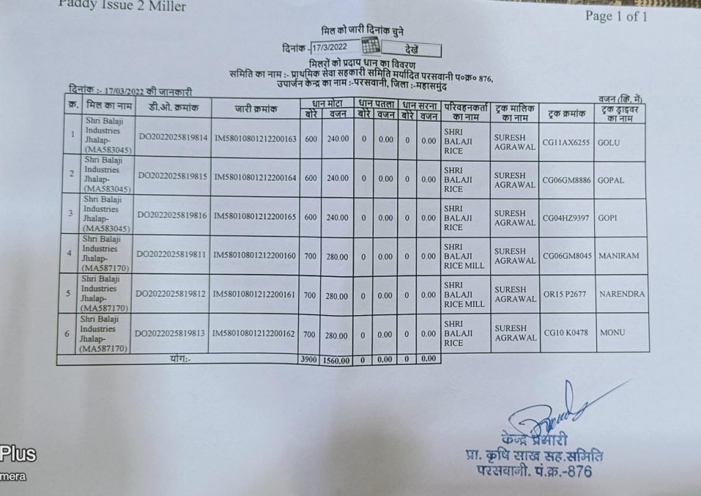 15 मार्च से 17 मार्च को कई ट्रको से धान का परिवहन ख़रीदी केंद्र परसवानी से मनीष एंड एसोसिएट्स बागबाहरा, श्री बालाजी इंडस्ट्रीज राईस झलप राईस मील में बताया गया है।