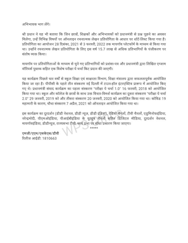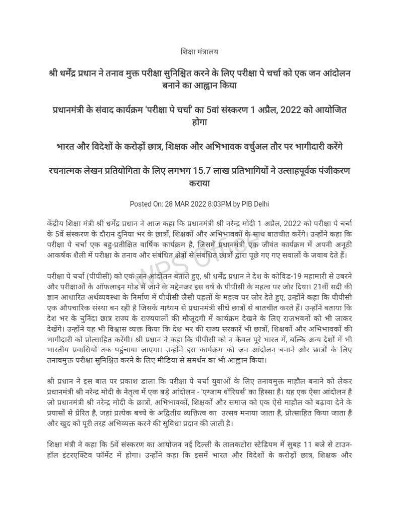 जिसमें प्राचार्य के द्वारा बच्चों व शिक्षकों के साथ सार्थक संवाद किया गया और बताया कि प्रधानमंत्री श्री नरेंद्र मोदी 1 अप्रैल 2022 को परीक्षा पे चर्चा कार्यक्रम में छात्रों, शिक्षकों और अभिभावकों के साथ सार्थक संवाद करेंगे। बच्चों के द्वारा भी आगामी परीक्षा से संबंधित अनेक प्रकार से प्रश्न पूछे गए और उनके मन में उठ रहे प्रश्नों का प्राचार्य महोदय के द्वारा उचित मार्गदर्शन किया गया तथा यह भी बताया कि 1 अप्रैल 2022 को माननीय प्रधानमंत्री नरेंद्र मोदी छात्रों के साथ बातचीत करेंगे और परीक्षा के तनाव को दूर करने के तरीके पर अपने मन की बात साझा करेंगे।