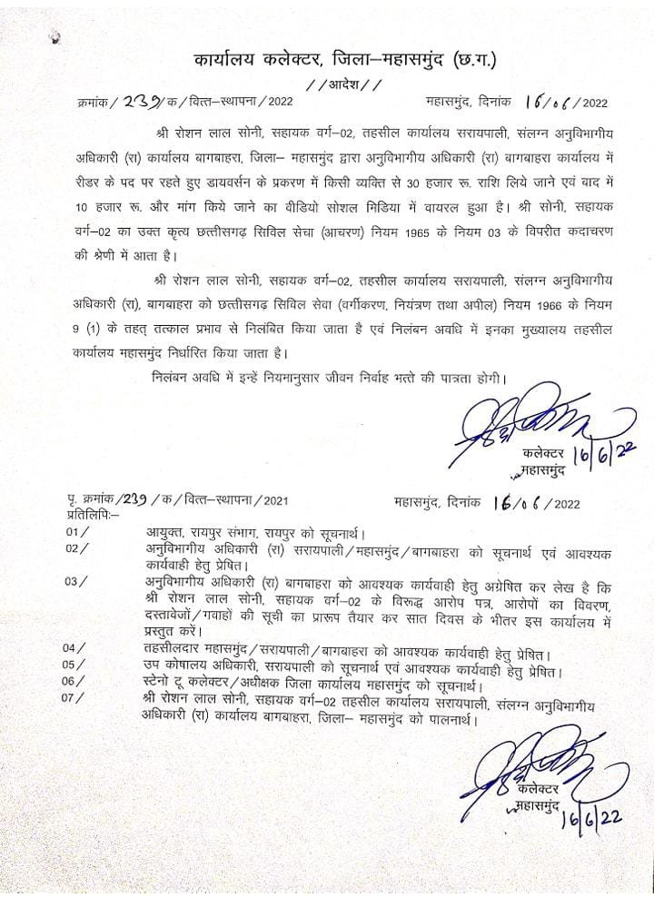 आपको बता दें कि एसडीएम ऑफिस में पदस्थ रीडर रोशन सोनी ने अमलीडीह के किसान जगदीश से 95 डिसमिल जमीन डायवर्शन के लिए ₹80000 की मांग किया था पीड़ित गरीब किसान जमीन गिरवी रख कर 30,000 रुपये लेकर एसडीएम ऑफिस गया और एसडीएम के लीडर को पैसा दिया और साथ ही उसने वीडियो भी बनवाया।वीडियो वायरल होने के बाद महासमुंद के कलेक्टर ने तत्काल घूसखोर रीडर रोशन सोनी को निलंबित कर दिया है साथ ही जांच के आदेश दिए हैं साथ ही कहा है कि जांच के बाद ऐसे मामले पर एफआईआर भी की जाएगी।