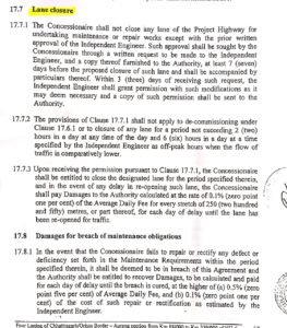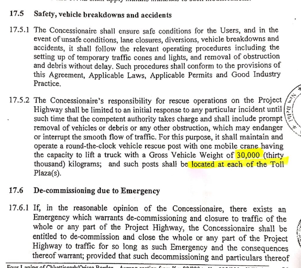 नेशनल हाइवे में बड़ी गाडी के एक्सीडेंट के बाद सड़क से एक्सीडेंटल गाडी को हटाने और सड़क को क्लियर करने के लिए प्रत्येक टोल प्लाजा में 30000 किलोग्राम [ 30 टन ] का क्रेन होना चाहिए ताकि एक्सीडेंट हुए लोड गाड़ियों को सड़क से किनारे किया जाए लेकिन BSCPL कंपनी के ढांक टोल और सराईपाली टोल दोनों टोल प्लाजा में एक भी 30000 किलोग्राम [30 टन ] का क्रेन नहीं है, ढांक टोल में लगभग 12 टन का एक क्रेन है वही छुहीपाली टोल में क्रेन है ही नहीं ! [ जबकि अग्रीमेंट में प्रत्येक टोल में एक 30 टन का क्रेन रखने की बात रखी गयी है] साथ ही एक्सीडेंट होने वाले गाडी मालिक से उसके गाडी उठाने के लिए किसी प्रकार का पैसा नहीं लिया जाना है क्योकि इस काम का पैसा टोल टैक्स में ही जुड़ा हुआ रहता है लेकिन BSCPLकंपनी द्वारा एक्सीडेंटल गाड़ियों से भी गाडी उठाने के लिए पैसा लिए जाने की शिकायत सुनने को मिलता रहता है !
