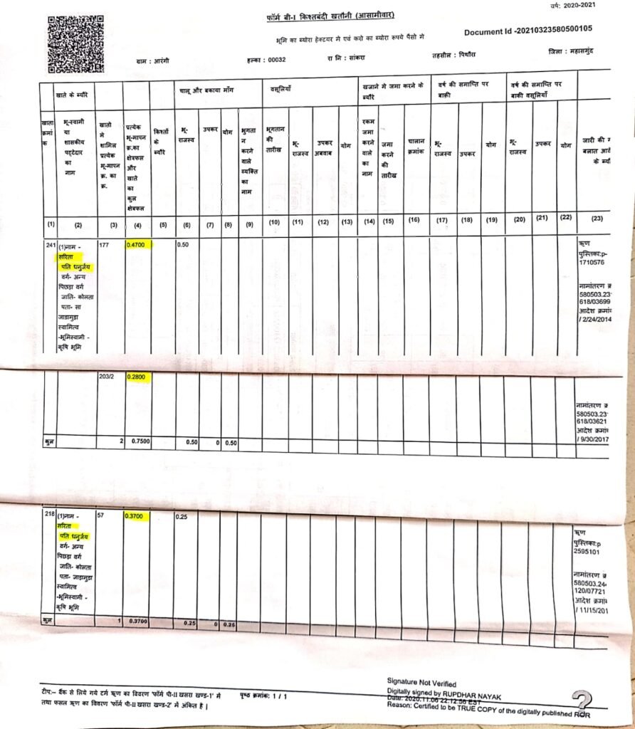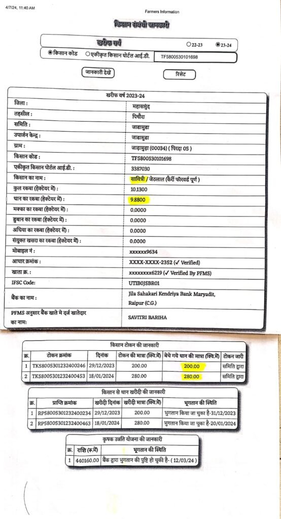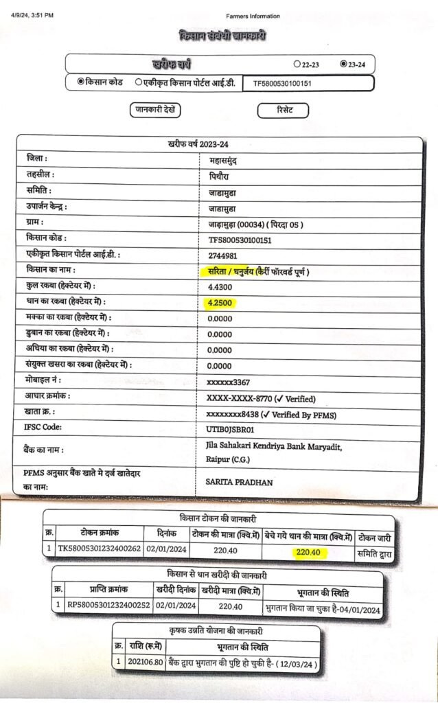 जिसे फर्जी तरीके से बढ़ाकर खेती की जमीन 4.2500 हेक्टेयर यानी 10 एकड़ 62 डिसमिल किया गया है। 2 एकड़ 80 डिसमिल खेती की जमीन में इन्हे 58 क्विंटल 80 किलो बेचने की पात्रता है पर इनके द्वारा समर्थन मूल्य में 220 क्विंटल धान बेचा गया है और बैंक से लाखो रुपये का आहरण किया गया है।